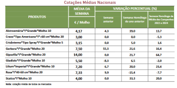 Em Entre Douro e Minho, área de mercado Entre Douro e Minho, verificou-se uma subida acentuada das cotações da gerbera grande em 160%, gladíolo grande 83%, rosa pequena (<40) em 67%, média (40-60) em 40% e grande (>60) em 29%, e alstroeméria 25%, devido a uma redução da oferta. Na Beira Litoral, área de mercado … Continue a ler Cotações – Flores e Folhagens – 1 a 7 de dezembro de 2025