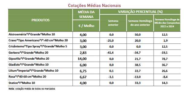 Na região Ribatejo Oeste, área de mercado Península de Setúbal, verificou-se uma diminuição da oferta de arália e a cotação teve uma subida de 25%. As cotações tiveram uma desvalorização para a gerbera grande em 50%, gerbera “Mini” grande 40% e cravo “Tipo Americano” 30%, devido a uma redução da procura. Esta semana não houve transações de crisântemo “Tipo Standard” nos operadores acompanhado.