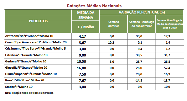 Cotações – Flores e Folhagens – 29 de dezembro a 4 de janeiro de 2025