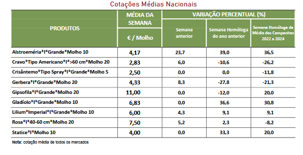 Em Entre Douro e Minho, área de mercado Entre Douro e Minho, com o aproximar do dia de Todos os Santos, a procura de flores começou a aumentar. Verificou-se uma subida das cotações da rosa tamanho pequeno (<40) em 33% e médio (40-60) em 17%, cravo “Tipo Americano”, “Tipo Spray” (cravina) e gerbera grande 25%. A rosa tamanho grande (>60) teve uma descida da cotação em 18%, produto não apresentou boa qualidade.
