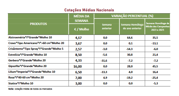 Em Entre Douro e Minho, área de mercado Entre Douro e Minho, verificou-se uma diminuição da oferta, o que levou a uma valorização das cotações da rosa tamanho pequeno (<40) de 33%, grande (>60) de 29% e média (40-60) de 20%. Por outro lado, as cotações registaram uma descida para a gerbera categoria I grande molho de 20 pés de 57% e lilium Imperial 14%, devido a um aumento da oferta.