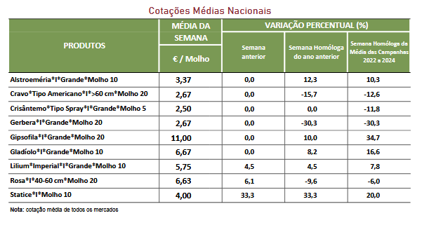 e média (40-60) em 14%, statice 33%, gerbera “Mini” grande 20% e girassol flor 14%, devido a uma diminuição da oferta.