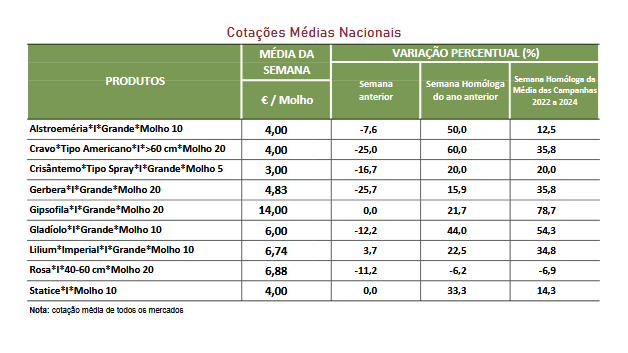 Em Entre Douro e Minho, área de mercado Entre Douro e Minho, após o dia de Todos os Santos, a procura de flores diminuiu, verificando-se uma quebra quase generalizada das cotações. Assim, as descidas foram para a gerbera grande 67%, cravo “Tipo Americano” e “Tipo Spray” (cravina) 50%, gladíolo 45%, rosa tamanho médio (40-60) em 38%, pequena (<40) em 25% e grande (>60) em 18%, e alstroeméria 33%.