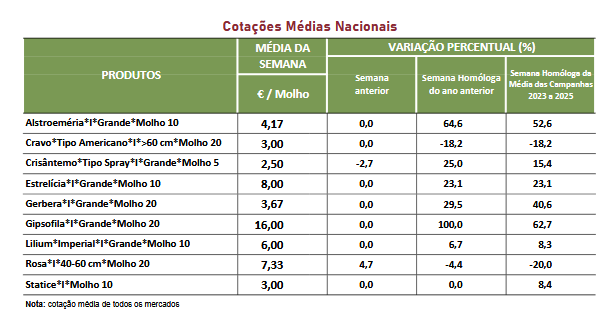 Em Entre Douro e Minho, área de mercado Entre Douro e Minho, teve início a campanha de produção e comercialização do gladíolo. Verificou- se uma subida da cotação da rosa tamanho médio (40-60) em 17%, devido a uma redução da oferta.