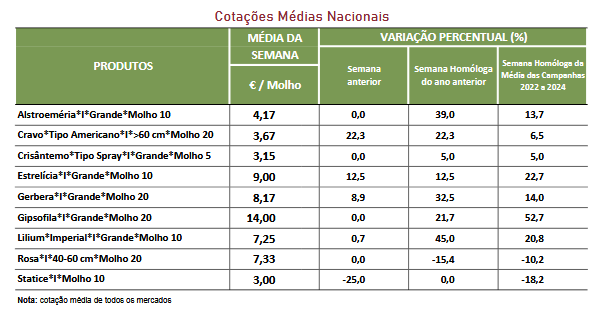 uma valorização acentuada das cotações do cravo “Tipo Americano” e “Tipo Spray” (cravina) em 100% e gerbera grande 15%, devido a uma