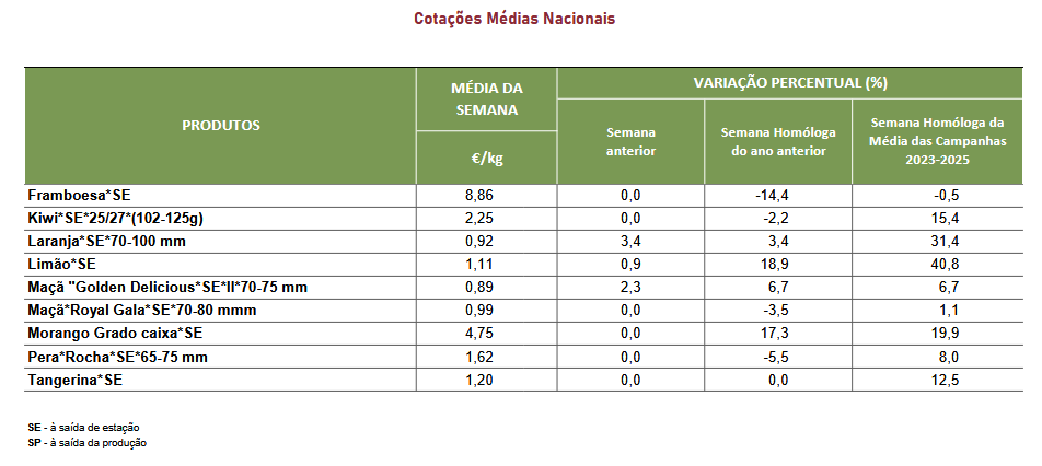 Cotações – Frutos frescos e secos – 9 a 15 de fevereiro de 2026