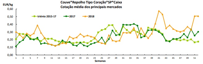 Na Região Centro, na área de mercado Beira Litoral, a oferta foi média/ baixa e a procura forte. Subida da cotação mínima e da mais frequente da couve “Portuguesa” e estabilidade para a couve “Lombardo e Repolho”.