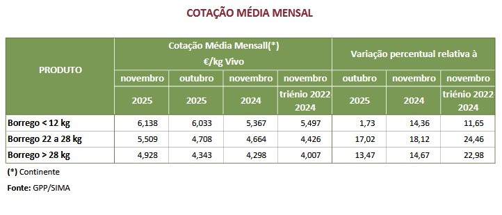 As cotações médias, de borrego < 12 kg, de borrego 13 kg a 21 kg e de borrego 22 kg a 28 kg e de aumentaram, 0,300 €/kg V, 0,506 €/kg V e