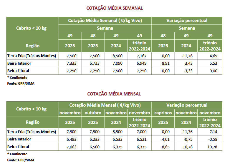 2 – A cotação média regional de cabritos < 10 kg de Trás-os-Montes foi retificada desde a semana 2 até à semana 10 de 2025.