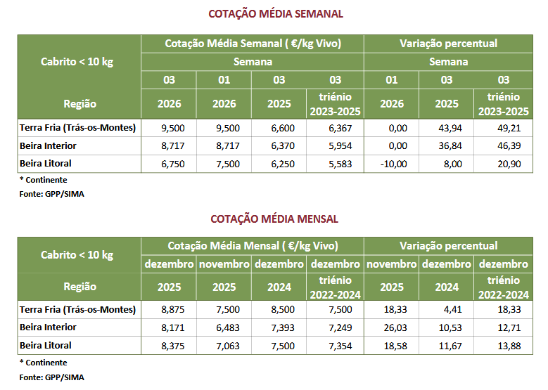 A cotação média de cabrito < 10 kg, na área de mercado Beira Litoral diminuiu 0,750 €/kg V. As cotações médias de cabrito < 10 kg, na Região Beira Interior e na área de mercado Terra Fria-Trás-os-Montes, não se alteraram.