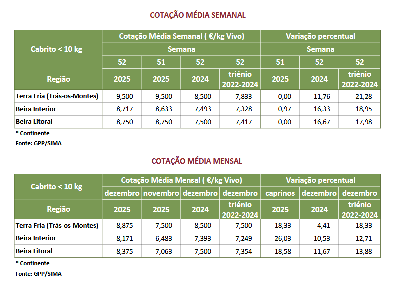 Na área de mercado Cova da Beira: as cotações, máxima e mais frequente, de cabrito < 10 kg, aumentaram, 0,35 €/kg V e 0,25 €/kg V, respetivamente.