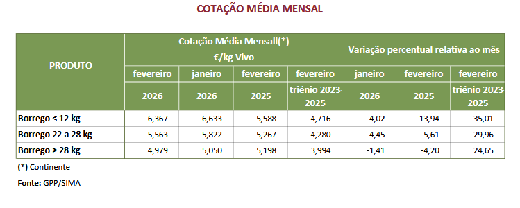 As cotações médias de borregos, < 12 kg e 13 kg a 21 kg, aumentaram, 0,427 €/kg V e 0,217 €/kg V, respetivamente. A cotação média de