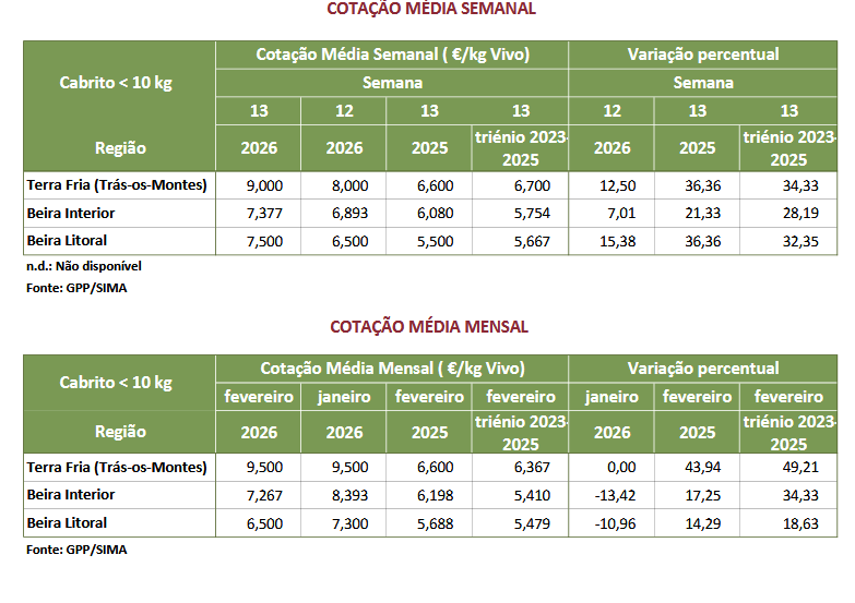 As cotações médias de cabrito < 10 kg, nas regiões, Beira Litoral, Beira Interior e área de mercado Terra Fria-Trás-os-Montes, aumentaram, 1,00 €/kg V, 0,483 €/kg V e 1,00 €/kg V, respetivamente.