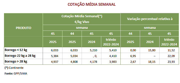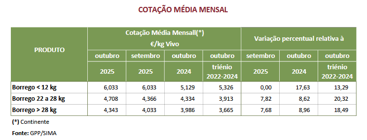 €/kg V, respetivamente. A cotação média de borrego < 12 kg, não se alterou.