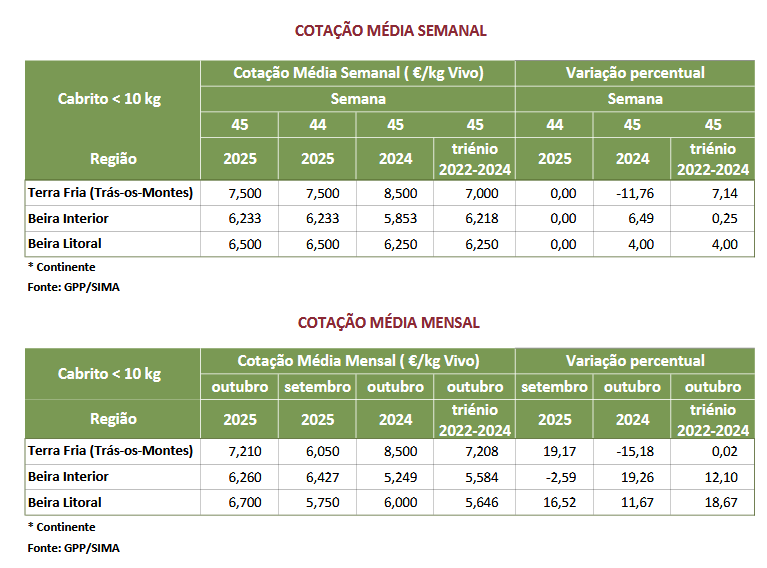 As cotações médias de cabrito < 12 kg , na região Beira Litoral, na Região Beira Interior e na área de mercado Terra Fria-Trás-os-Montes, não se alteraram.