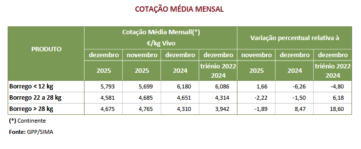 As cotações médias de borregos, 13 kg a 21 kg, 22 kg a 28kg e > 28 kg, aumentaram, 0,154 €/kg V, 0,168 €/kg V e 0,178 €/kg V, respetivamente. A cotação média de borrego < 12 kg não se alterou.
