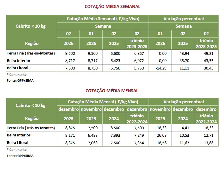 A cotação média de cabrito < 10 kg, na área de mercado Beira Litoral diminuiu 1,250 €/kg V. As cotações médias de cabrito < 10 kg, na Região Beira Interior e na área de mercado Terra Fria-Trás-os-Montes, não se alteraram.