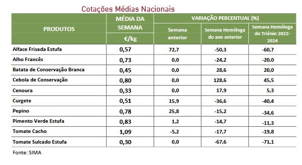 Na região Entre Douro e Minho, área de mercado Entre Douro e Minho, chegou ao fim a campanha de produção e comercialização do feijão-verde “Riscadinho”, pepino e pimento vermelho. Verificou-se uma subida das cotações da alface lisa estufa à saída de produção (SP) em 88%, alface frisada estufa SP 33%, nabiça SP molho 32%, tomate “Sulcado” SP calibre 67-81 25% e calibre >81 em 22%, devido a uma diminuição da oferta. Uma menor procura desvalorizou as cotações do feijão-verde “Achatado Direito estufa” SP em 20%. As cotações do nabo com rama SP e da curgete SP não calibrada, tiveram uma descida em 18% e 11% respetivamente, devido a um aumento da oferta.