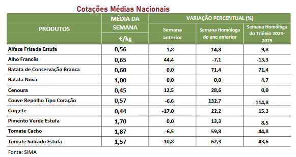 Na região Entre Douro e Minho, área de mercado Entre Douro e Minho, verificou-se uma subida das cotações do nabo com rama à saída de produção (SP) em molho de 21% e da cenoura SP categoria II calibre >20 saco de 11%, devido a uma diminuição da oferta. Por outro lado, o aumento da oferta levou a uma desvalorização das cotações da curgete SP não calibrada de 29%, do espinafre SP II em molho de 24%, da alface lisa estufa SP II >100 de 17%, da couve “Penca” SP II não calibrada e do “Repolho Tipo Coração” SP II >350 de 13% e da nabiça SP em molho de 12%.