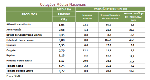 Na região Ribatejo Oeste, área de mercado Oeste, a maior parte da comercialização dos produtos hortícolas realiza-se em leilão. Verificou-se um aumento das cotações do pimento verde SP não calibrado em 75%, feijão-verde “Largo” SP 52%, nabo com rama SP 44%, alface frisada SP não calibrada 42%, pimento vermelho SP não calibrado 34%, couve “Brócolos” SP não calibrada 18% e feijão-verde “Douradinho” SP 17%, devido a uma maior procura, oferta quase nula e melhor qualidade dos produtos comparando com a semana anterior. Um aumento da procura e da oferta, com produtos de melhor qualidade, valorizaram as cotações do tomate “Redondo maduro” SP tamanho grado em 71%, batata-doce SP não calibrada 56%, couve “Lombardo” SP não calibrada 52% e couve-flor SP não calibrada 42%. Subida também para a cotação da curgete SP não calibrada em 29% e abóbora “Tipo Francesa” SP 25%, devido a uma maior procura com redução da oferta e melhor qualidade dos produtos. Com a procura a diminuir, oferta quase nula e pior qualidade do produto, as cotações desvalorizaram para o tomate “Coração de Boi” SP grado em 26%. O tomate “Redondo” SP médio desvalorizou 14%, dado se ter verificado um aumento da oferta.