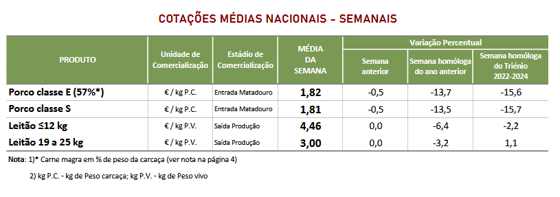 As cotações médias nacionais de porco classe E e classe S desceram em relação à semana anterior (-0,01 €/kg), pela 17.ª semana consecutiva. Estabilidade das cotações médias nacionais para o leitão <12 kg e 19–25 kg.