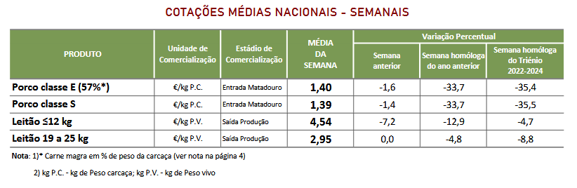 Descida das cotações médias nacionais do porco classe E e classe S, em 0,02 €/kg, e do leitão <12 kg, em 0,35 €/kg. Manutenção da cotação média