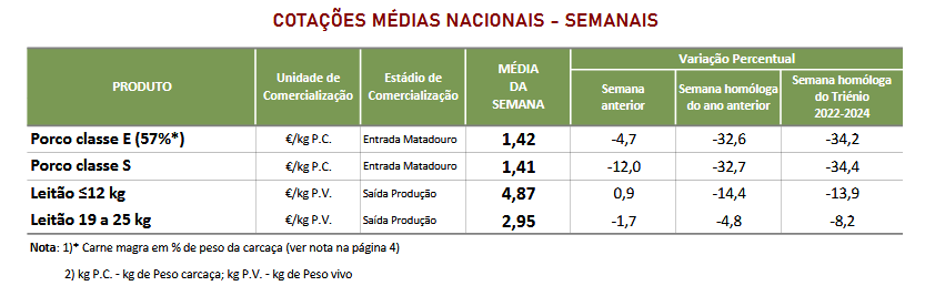 As cotações médias nacionais do porco classe E e classe S e do leitão 19-25 kg desceram 0,07 €/kg, 0,19 €/kg e 0,05 €/kg, respetivamente. A cotação média nacional de leitão <12 kg subiu 0,04 €/kg.
