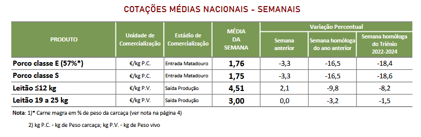 As cotações médias nacionais do porco classe E e classe S desceram 0,06 €/kg. A cotação média nacional de leitão <12 kg subiu 0,09 €/kg. Estabilidade