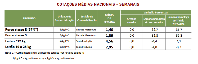 Manutenção das cotações médias nacionais do porco classe E e classe S e do leitão 19-25 kg e <12 kg.