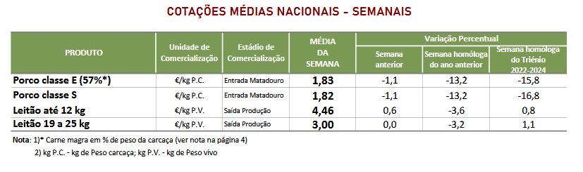As cotações médias nacionais de porco classe E e classe S desceram em relação à semana anterior (-0,02 €/kg), pela 16.ª semana consecutiva. As cotações médias nacionais de leitão <12 kg subiram 0,02 €/kg. Estabilidade das cotações médias nacionais para o leitão 19–25 kg.