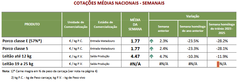 O Porco classe E (57%*) atingiu um preço de 1.77 € / kg P.C. na presente semana. Ficou 23% abaixo do preço do mesmo período do ano 2025 e 2% acima do período anterior.