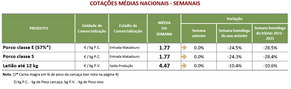 O Porco classe E (57%*) atingiu um preço de 1.77 € / kg P.C. na presente semana. Ficou 24% abaixo do preço do mesmo período do ano 2025 e igual