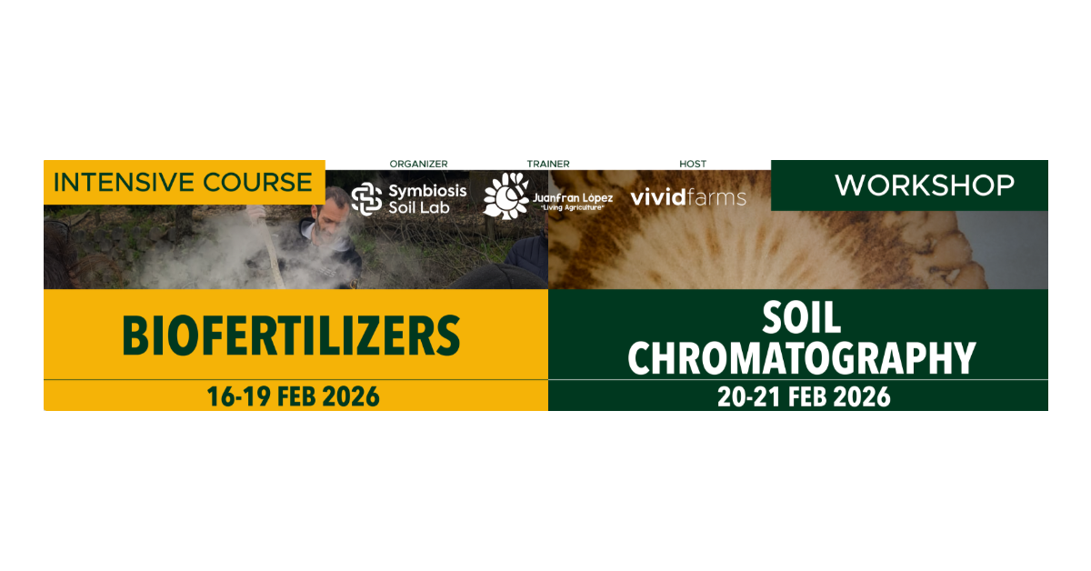 A Symbiosis Soil Lab https://symbiosis-soillab.com, em parceria com a Vivid Farms https://www.vivid-farms.com , está a organizar dois cursos a realizar na sede Vivid Farms, em Santarém, entre 16 e 21 de fevereiro de 2026.