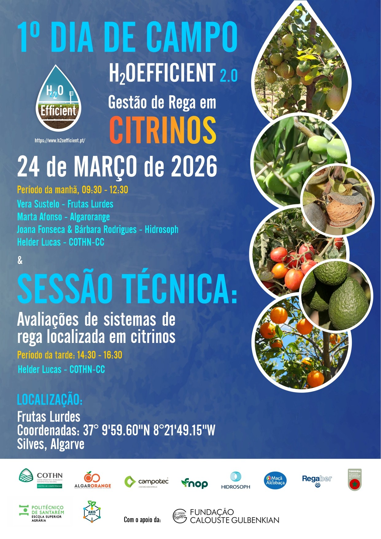 Já na próxima 3ª feira, dia 24, em Silves, no Algarve, realiza-se o 1º Dia de Campo sobre gestão de rega em citrinos, no âmbito do projeto H2OEfficient, juntamente com uma Sessão Técnica sobre avaliação de sistemas de rega localizada também em citrinos.