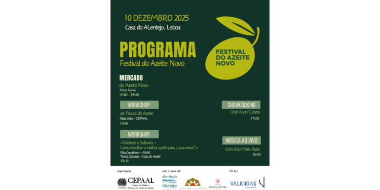 O CEPAAL – Centro de Estudos e Promoção do Azeite do Alentejo, anuncia a alteração da data do 3º Festival do Azeite Novo em Lisboa. Inicialmente previsto para 11 de dezembro, o evento realiza-se agora no dia 10 de dezembro, na emblemática Casa do Alentejo.
