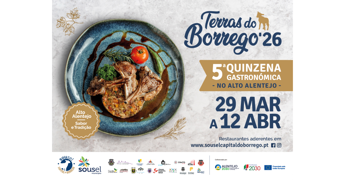 Até 12 de abril de 2026, Sousel volta a promover a Quinzena Gastronómica Terras do Borrego, afirmando-se como um dos principais momentos de valorização da gastronomia tradicional do Alto Alentejo.