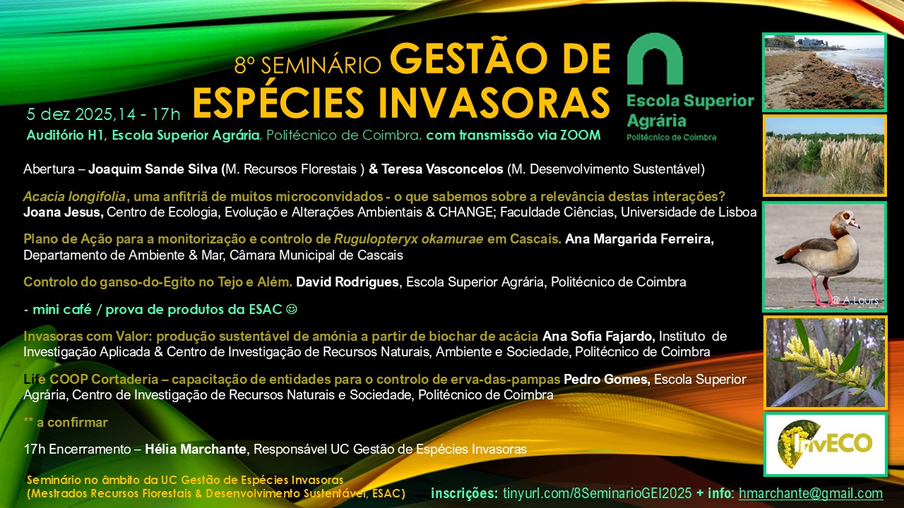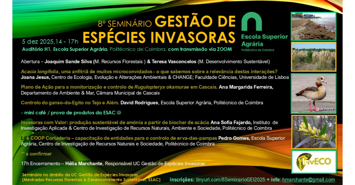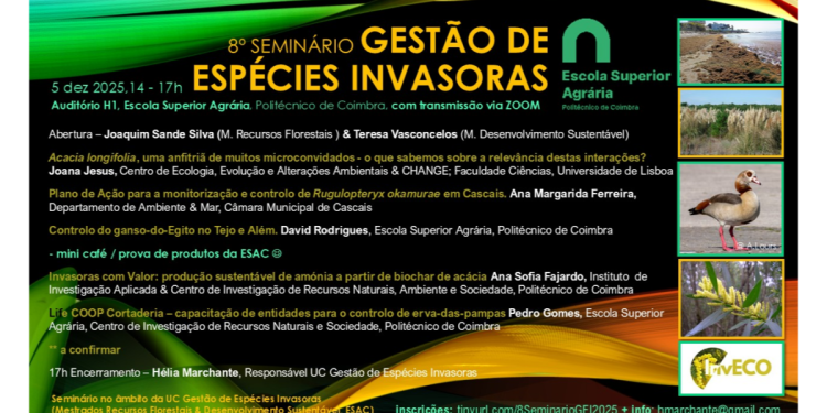A Escola Superior Agrária do Politécnico de Coimbra (ESAC-IPC) leva a cabo, no próximo dia 05 de dezembro, das 14h00 às 17h00, presencialmente (Auditório H1) e com transmissão via Zoom, a 8.ª edição do Seminário “Gestão de Espécies Invasoras”.