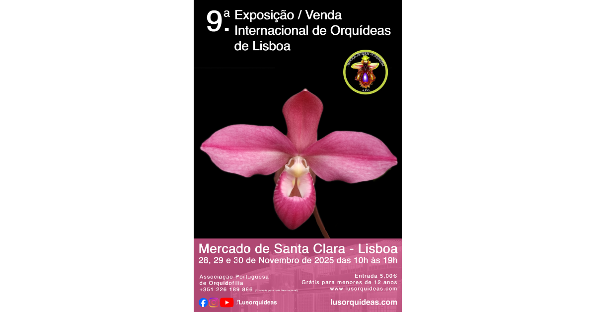 A Associação Portuguesa de Orquidofilia (A.P.O.) tem o orgulho de anunciar a realização da 9.ª Exposição / Venda Internacional de Orquídeas de Lisboa, que terá lugar nos dias 28, 29 e 30 de Novembro de 2025, no emblemático Mercado de Santa Clara, junto à Feira da Ladra, em Lisboa.