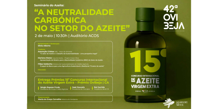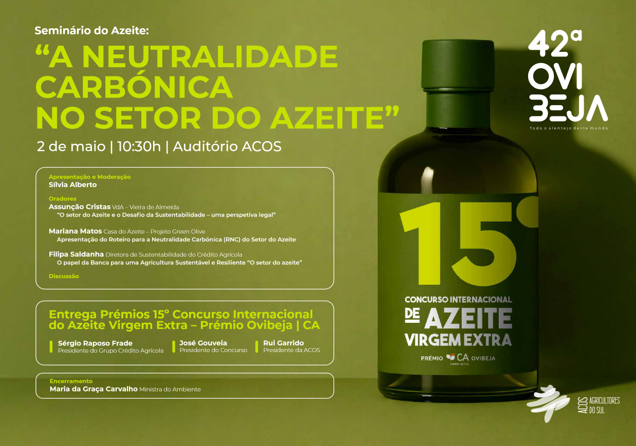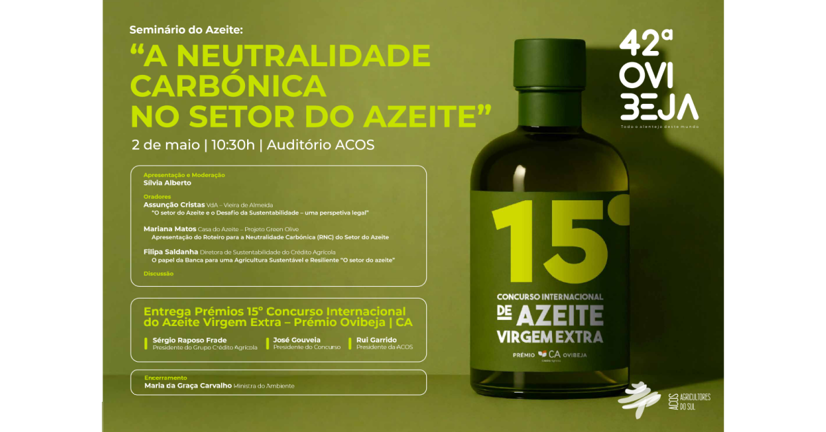 O Seminário do Azeite “A Neutralidade Carbónica no Setor do Azeite”, integrado na 42.ª Ovibeja, realizar-se-á no dia 2 de maio, às 10h30, no Auditório ACOS.