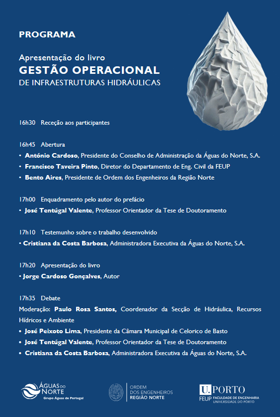 A sessão tem organização conjunta da Águas do Norte, S.A., da Faculdade de Engenharia da Universidade do Porto (FEUP) e da Ordem dos Engenheiros – Região Norte.