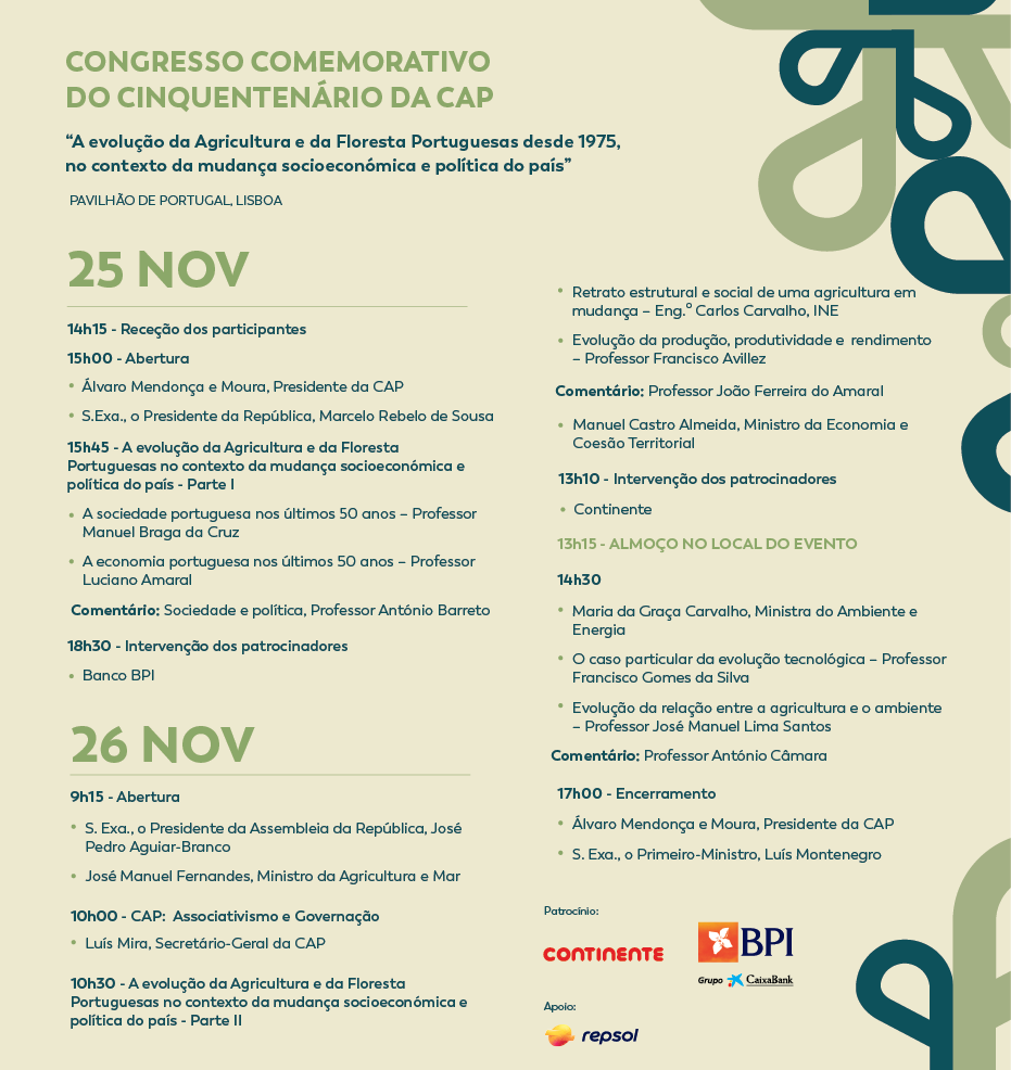 No momento em que assinala o seu cinquentenário, a Confederação dos Agricultores de Portugal (CAP) organiza um congresso comemorativo dedicado à evolução da Agricultura e da Floresta Portuguesa desde 1975, enquadrada no contexto de mudança socioeconómica e política de Portugal. O evento realiza-se no Pavilhão de Portugal, no Parque das Nações, na próxima semana, nos dias 25 e 26 de novembro.
