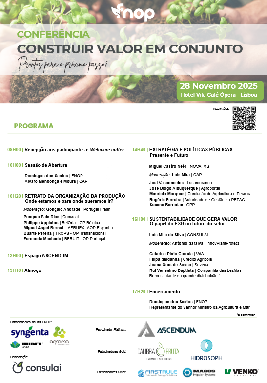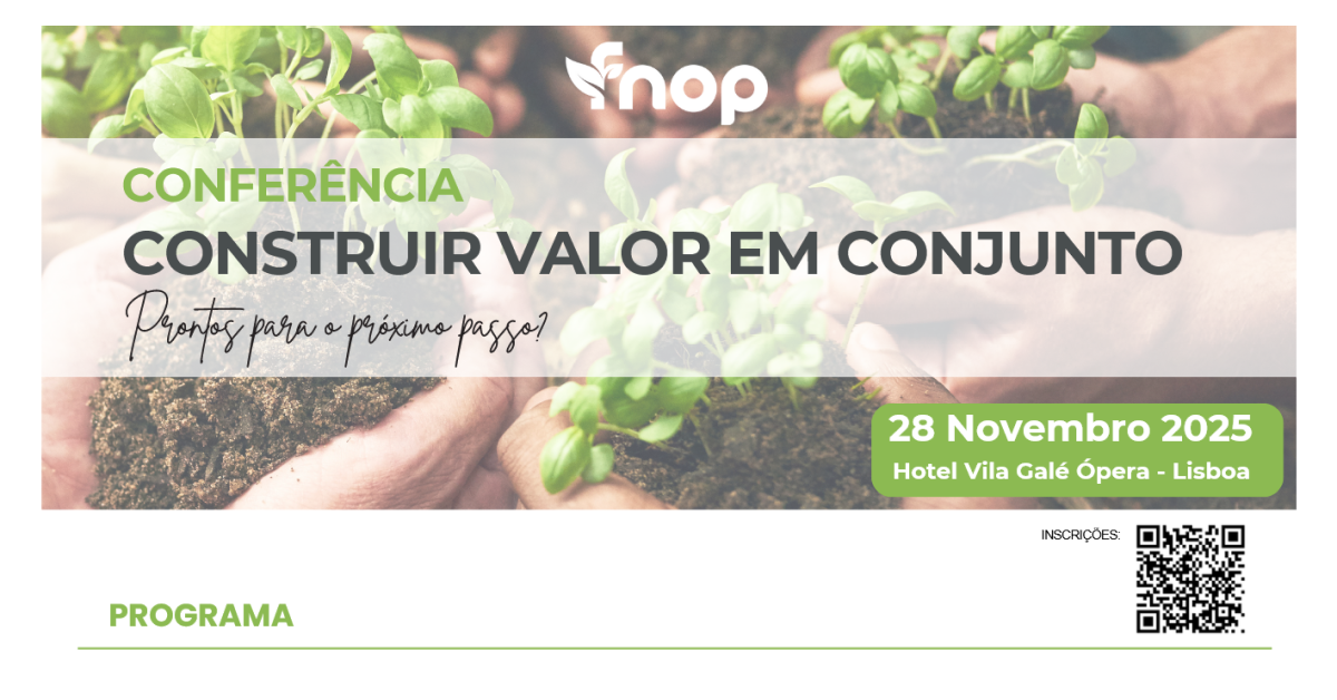 A FNOP realiza no dia 28 de novembro de 2025, no Hotel Vila Galé Ópera, em Lisboa, a conferência “Construir Valor em Conjunto”, um encontro que pretende reunir organizações de produtores, produtores, empresas, especialistas e decisores para refletir sobre o presente e projetar o futuro do setor hortofrutícola nacional. Será um momento de debate aberto, onde serão analisadas as dinâmicas atuais da organização da produção e o papel das políticas públicas na criação de condições para um crescimento sustentado.