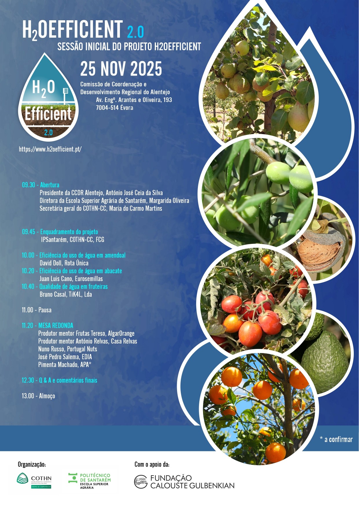 O projeto H2OEfficient, coordenado pela Escola Superior Agrária de Santarém (ESAS) e pelo Centro Operativo e Tecnológico Hortofrutícola Nacional ‒ Centro de Competências (COTHN‑CC), entra numa nova fase no período 2025‑2027, com um plano alargado e ambicioso. Esta nova edição reforça a missão do projeto: promover práticas agrícolas mais eficientes no uso da água, respondendo aos desafios crescentes da escassez hídrica, das alterações climáticas e da sustentabilidade do setor agrícola em Portugal.