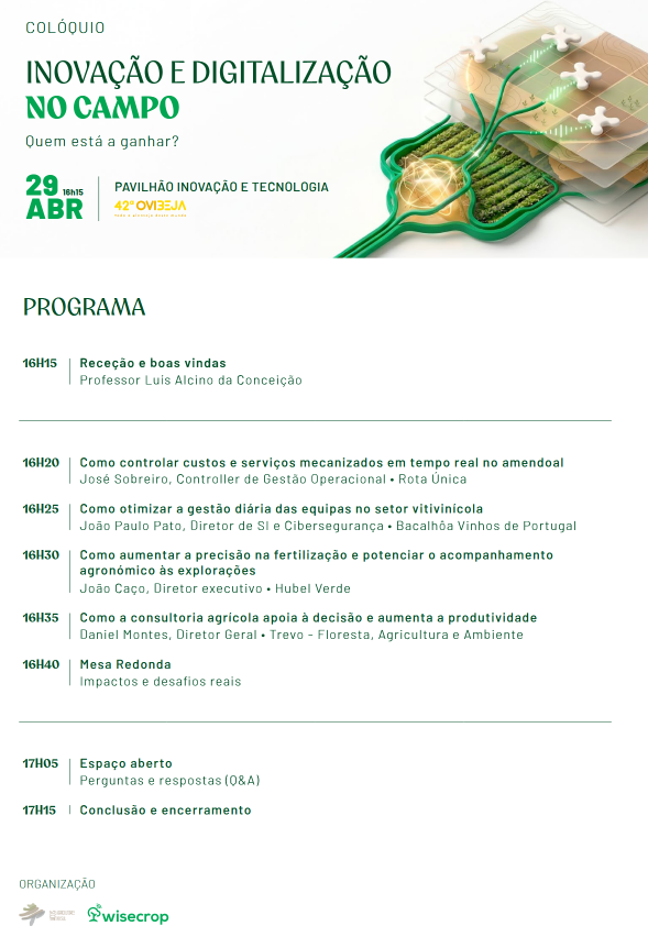 O colóquio “Inovação e Digitalização no Campo: Quem está a ganhar?”, organizado pela ACOS e pela Wisecrop, terá lugar no dia 29 de abril de 2026, às 16h15, no Pavilhão Inovação e Tecnologia da 42.ª Ovibeja.