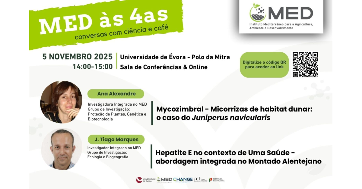 Nesta sessão serão apresentados dois projetos exploratórios financiados pelo MED. Ana Alexandre, investigadora do MED e docente no Departamento de Biologia da Universidade de Évora, dará a conhecer o projeto Mycozimbral – Micorrizas de habitat dunar: o caso do Juniperus navicularis, centrado na importância dos fungos do solo em ecossistemas dunares e no contributo destas simbioses para o restauro ambiental.