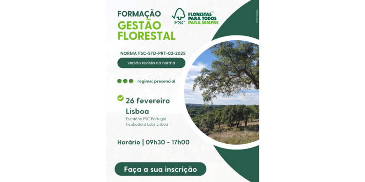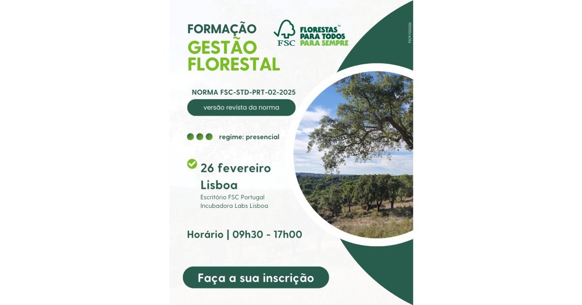 Uma sessão presencial promovida pelo Forest Stewardship Council – FSC para capacitar titulares de certificado, entidades certificadoras, técnicos florestais e consultores para os requisitos da norma FSC de Gestão Florestal para Portugal, que foi revista ainda em 2025. Em foco estarão as principais mudanças entre versões desta norma, os novos indicadores introduzidos e a relação com outros documentos normativos. A sessão de formação decorre em Lisboa, no dia 26 de fevereiro de 2026, das 09h30 às 17h00.