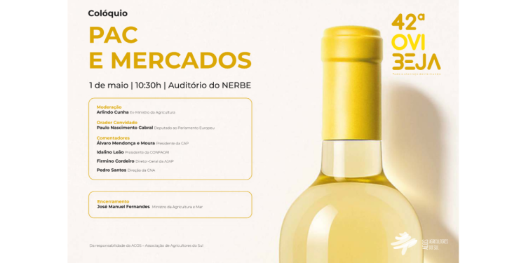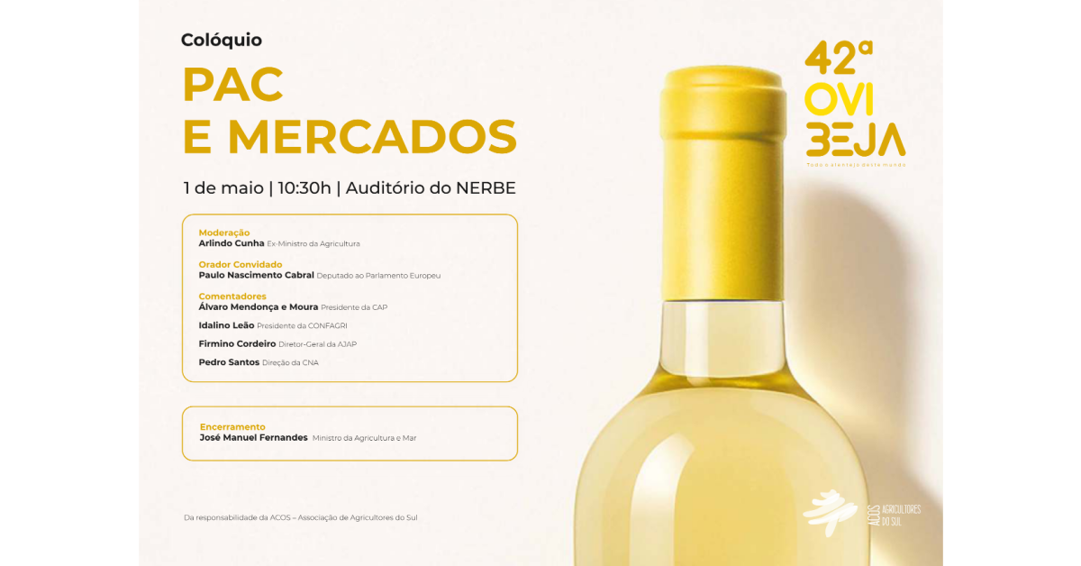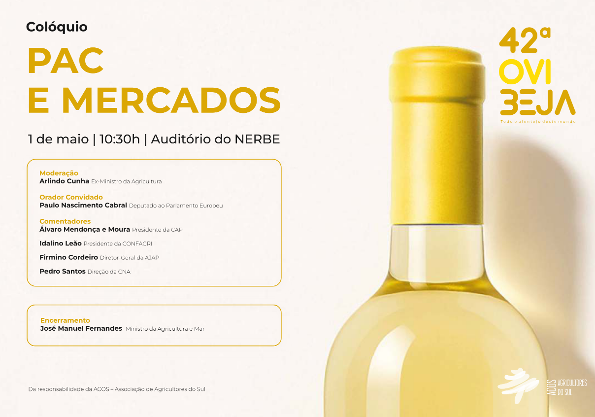 O colóquio “PAC e Mercados”, inserido na programação da 42.ª Ovibeja, realizar-se-á no dia 1 de maio, às 10h30, no Auditório do NERBE. Sob a responsabilidade da ACOS – Associação de Agricultores do Sul, o evento conta com a moderação do ex-Ministro da Agricultura, Arlindo Cunha, e traz como orador convidado o Deputado ao Parlamento Europeu, Paulo Nascimento Cabral.