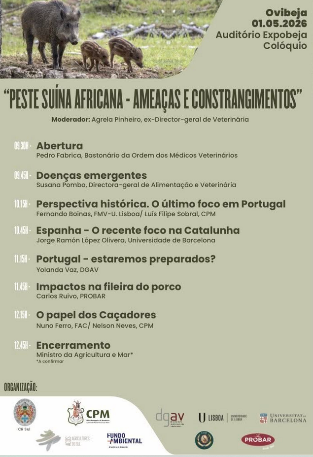 O colóquio “Peste Suína Africana – Ameaças e Constrangimentos” terá lugar no dia 1 de maio de 2026, às 09h30, no Auditório Expobeja. Moderado por Agrela Pinheiro (ex-Diretor-geral de Veterinária), o evento reúne especialistas nacionais e internacionais para debater a biossegurança e os desafios sanitários da fileira suína.