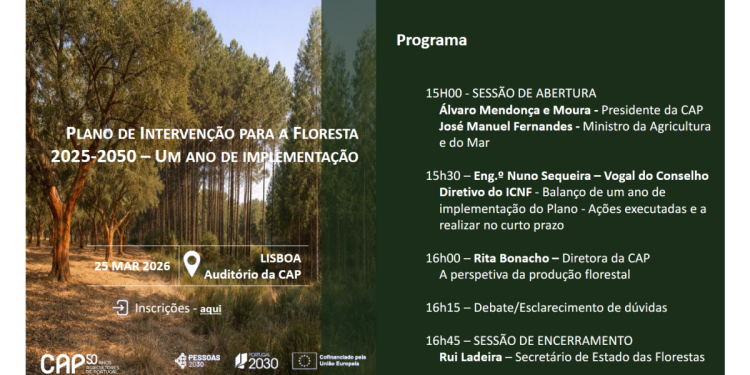 A CAP – Confederação dos Agricultores de Portugal organiza o seminário “Plano de Intervenção para a Floresta 2025-2050 – Um ano de implementação”, que visa avaliar o primeiro ano de execução do Plano e que decorrerá na nossa sede, em Lisboa, no dia 25 de março pelas 15h.