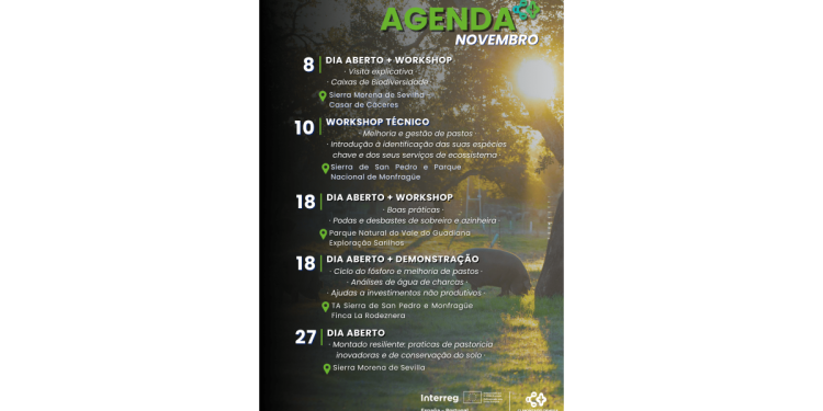 - Evento “Montado resiliente: práticas pecuárias inovadoras e conservação do solo”, em Sierra Morena de Sevilla, a 27 de novembro, organizado pela CorSevilla.